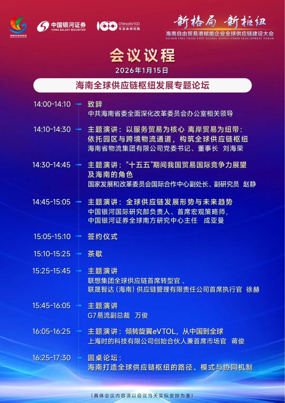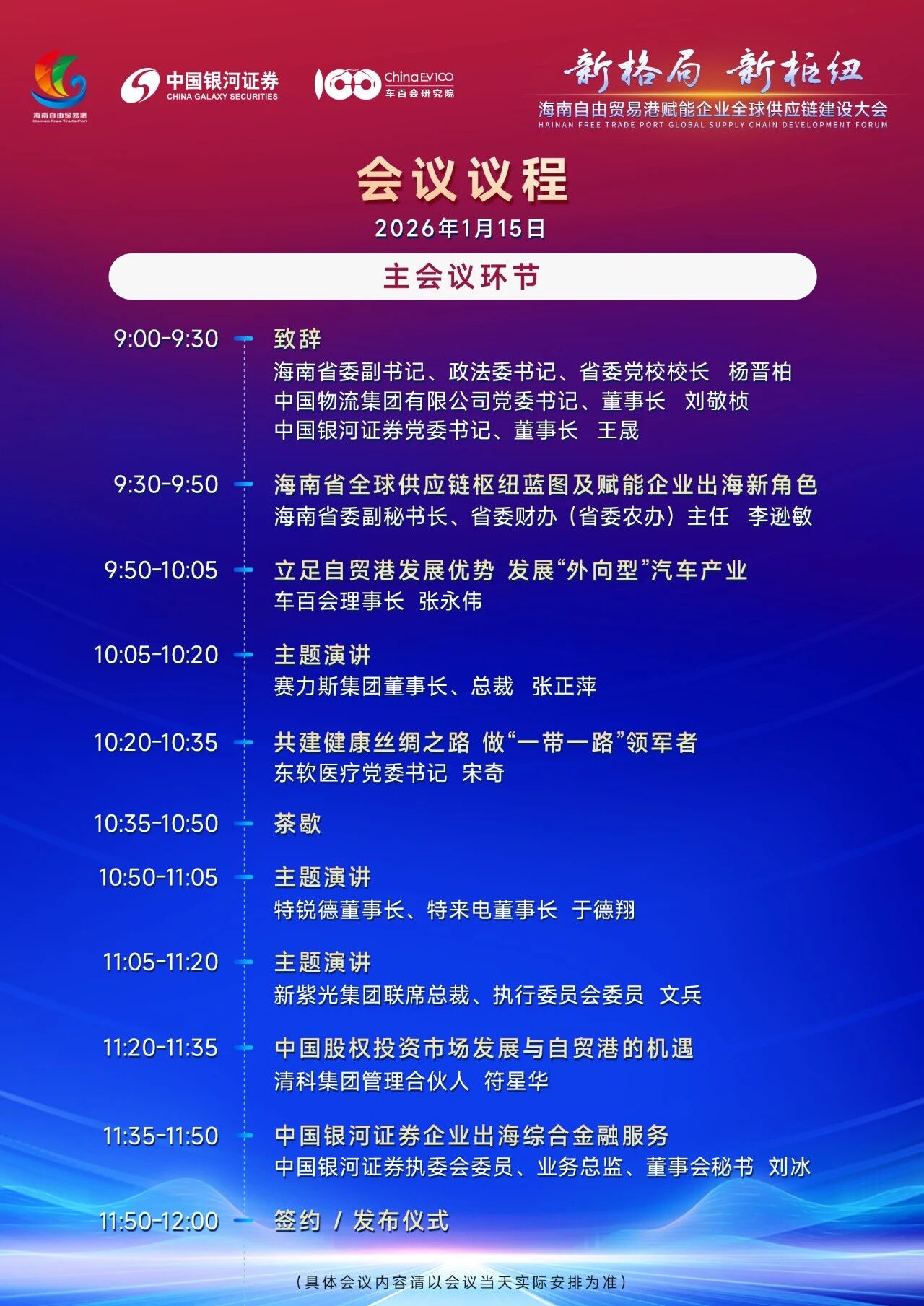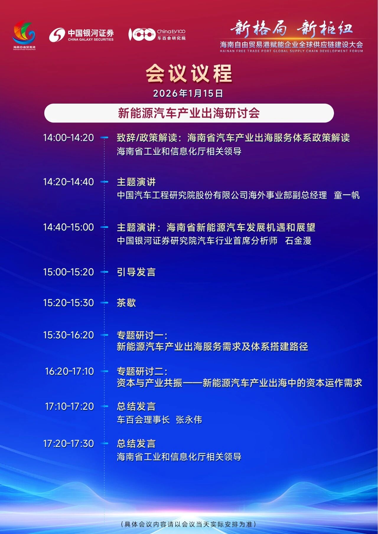 大会由海南省委财办主办,中国银河证券、车百会联合承办,精心设置三大核心板块:主会议、海南全球供应链枢纽发展专题论坛、新能源汽车产业出海研讨会,内容层层递进、亮点纷呈。