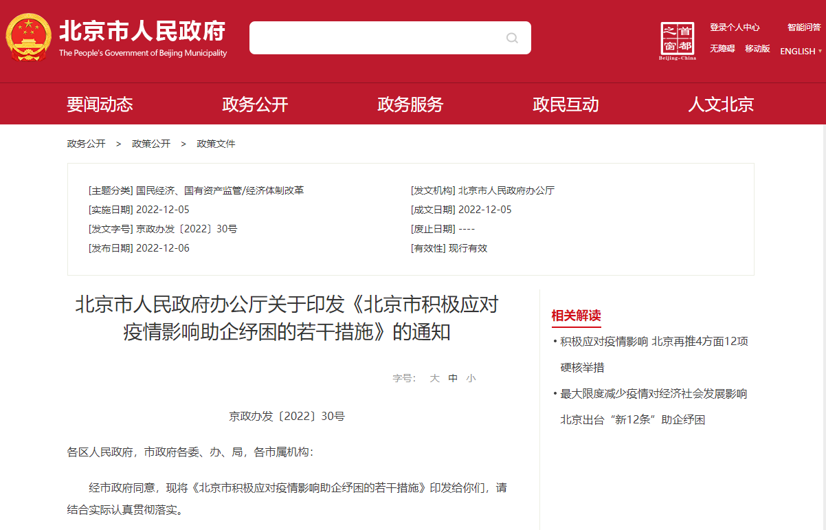 12月6日,北京市人民政府办公厅发布关于印发《北京市积极应对疫情影响助企纾困的若干措施》的通知。